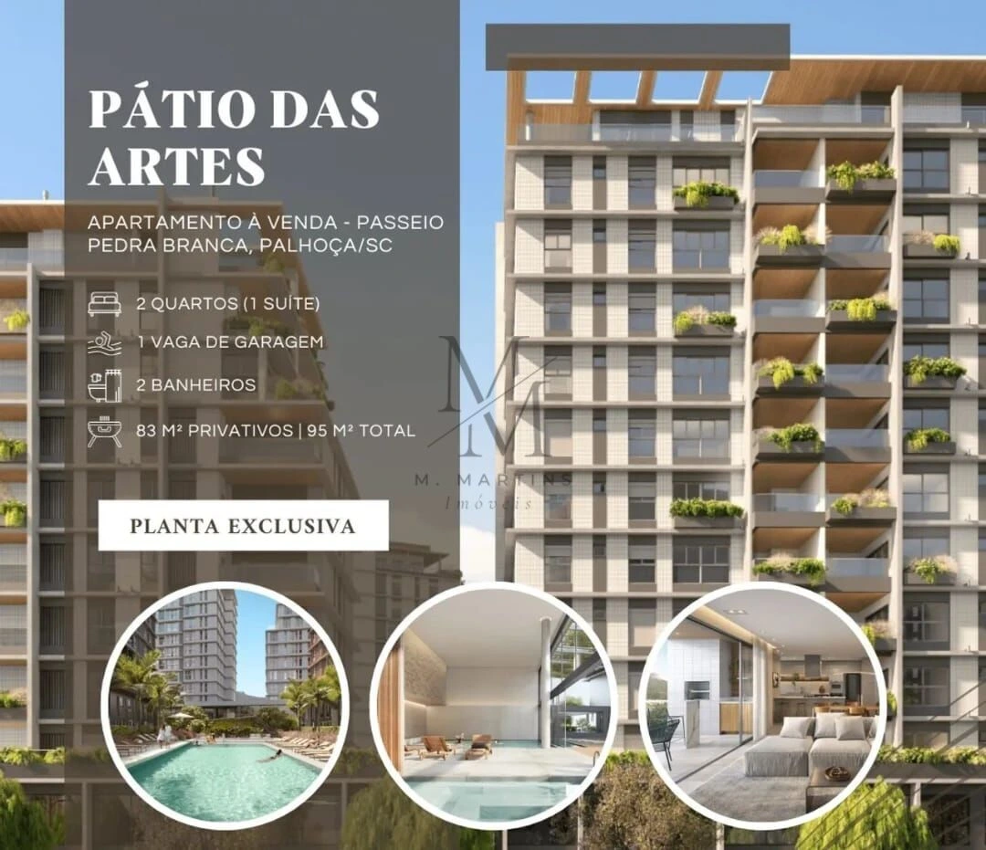 Sobre o ImóvelDescubra o prazer de morar no coração da Pedra Branca, em um apartamento planejado para oferecer bem-estar, modernidade e funcionalidade em cada detalhe.72 m² de área privativa2 dormitórios, sendo 1 suíteBanheiro social com ventilação naturalSala integrada com cozinha1 vaga de garagemExcelente posição solar – frente norteSobre o Empreendimento – Pátio das ArtesUm projeto contemporâneo e completo, que une arte, arquitetura e urbanismo para proporcionar a experiência de morar, trabalhar e se divertir em um só lugar.