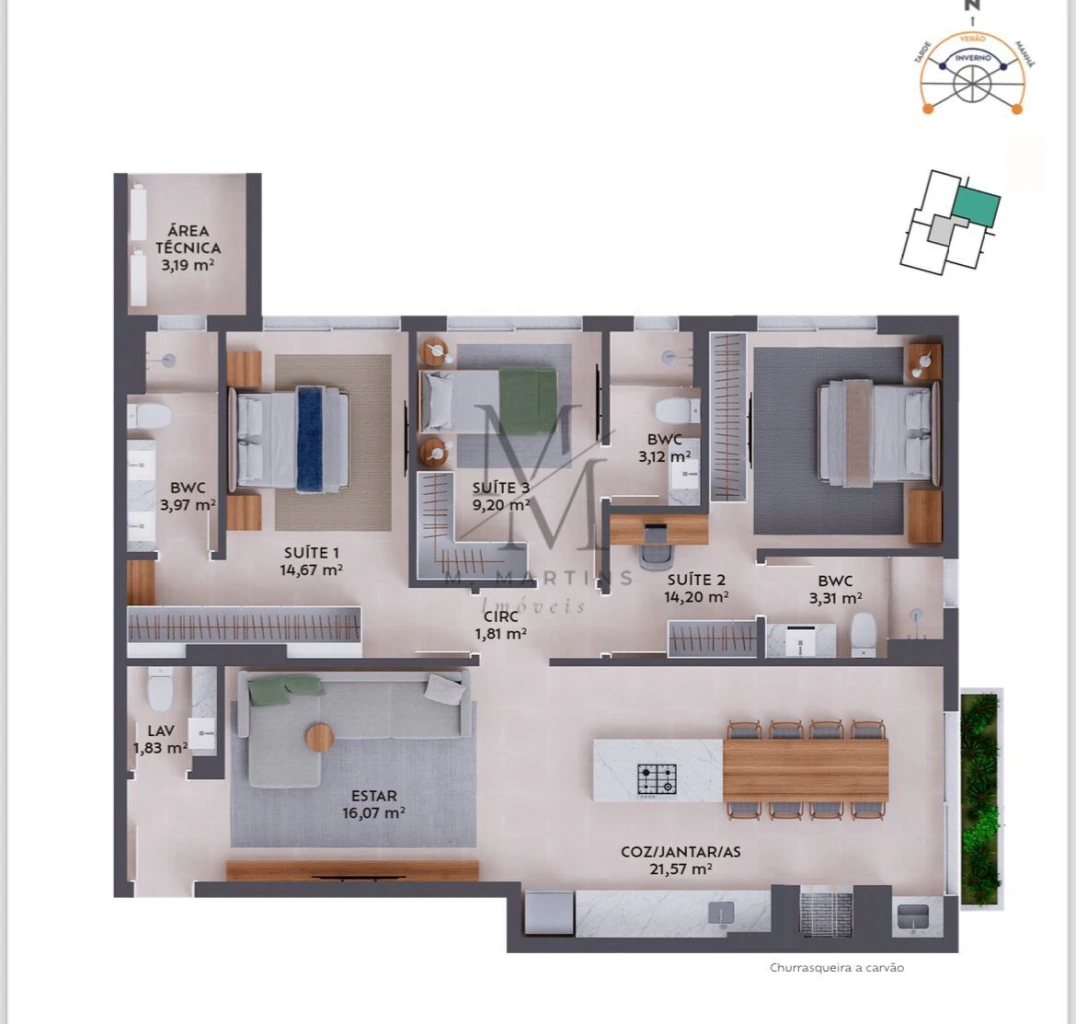 Lindo Apartamento com 03 dormitórios, sendo 03 suítes, lavabo, sala de estar e jantar, cozinha e área de serviço.