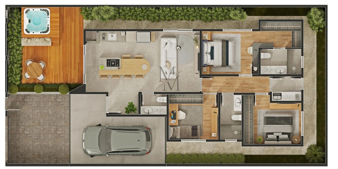 Características do Imóvel:Área construída: 112,45 m²Área do terreno: 200,00 m²3 dormitórios, sendo 1 Suíte Master com Closet1 Lavabo na área social1 Banheiro para os dormitórios1 Banheiro exclusivo na SuíteAcabamentos de Alto Padrão:Piso porcelanato nas áreas friasPiso vinílico nos quartosRodapés em poliestirenoRebaixo em gesso nos tetosMassa corrida nas paredesFechadura eletrônica na porta principalPlanta Inteligente:Conceito aberto com integração entre sala e cozinhaPé direito elevado na área socialÁrea de serviço internaCorredor nas duas laterais da casa, proporcionando melhor circulação de ar e iluminação natural1 vaga de garagem cobertaSustentabilidade e Infraestrutura Preparada para o Futuro:Espera para instalação de piscina ou jacuzziEspera para banheira na suíteEspera para sistema fotovoltaicoTomada para carro elétricoEspera para aquecimento de água solar ou a gásEntrega prevista: Dezembro de 2025 Imagens meramente ilustrativas.