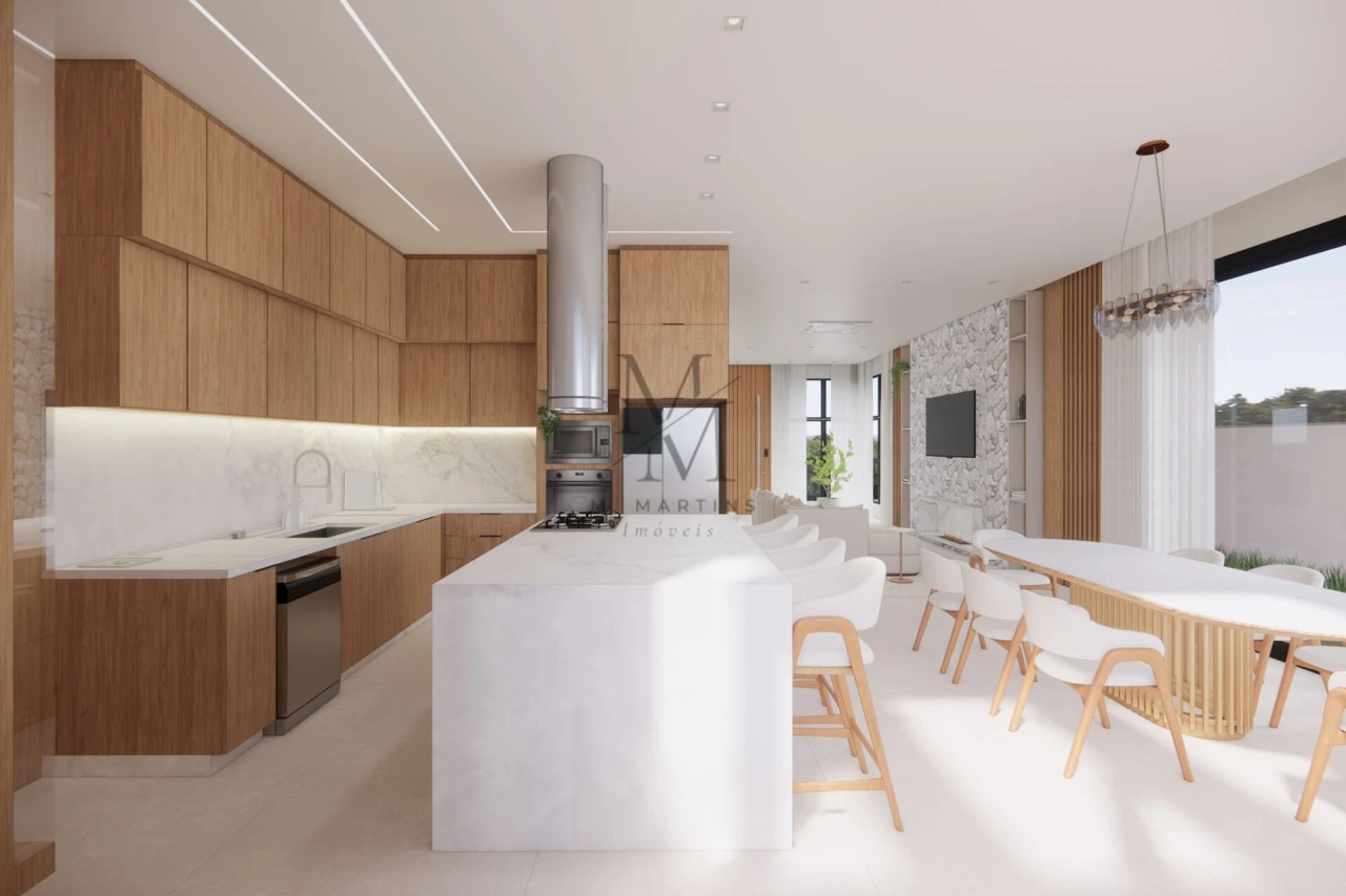 Casa 3 quartos em Pedra Branca, Palhoça com 411m² de área privativa e melhor espaço interno do condomínio. O imóvel possui dois pavimentos distribuídos em sala de estar/TV com lareira à gás integrada à sala de jantar/cozinha, lavabo, lavanderia, espaço gourmet de 25m² com churrasqueira e forno à lenha, garagem para 2 carros, demi-suíte no térreo e duas suítes amplas com sacada mais suíte master com sacada de 25m² e vista para área verde no pavimento superior. Acabamentos incluem pisos e revestimentos em grandes formatos, esquadrias de PVC com vidros laminados duplos, móveis planejados em MDF, sistema de automação, placas fotovoltaicas e condicionadores de ar instalados.
